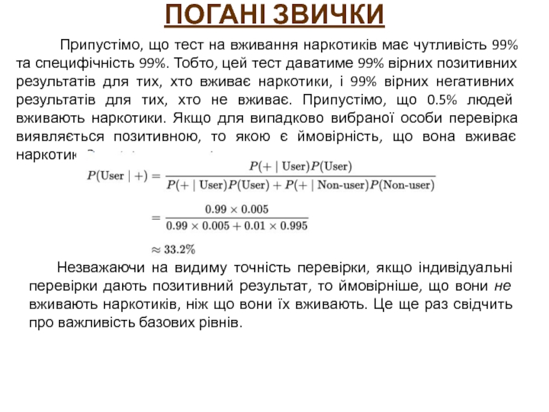 Слайд 58Припустімо, що тест на вживання наркотиків має чутливість 99% та