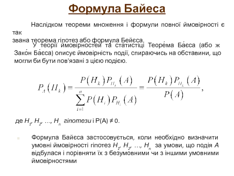 Формула Байєса застосовується, коли необхідно визначити умовні ймовірності гіпотез Н1, Н2, …, Нn за умови, що подія А відбулася і порівняти їх з безумовними чи з іншими умовними ймовірностями