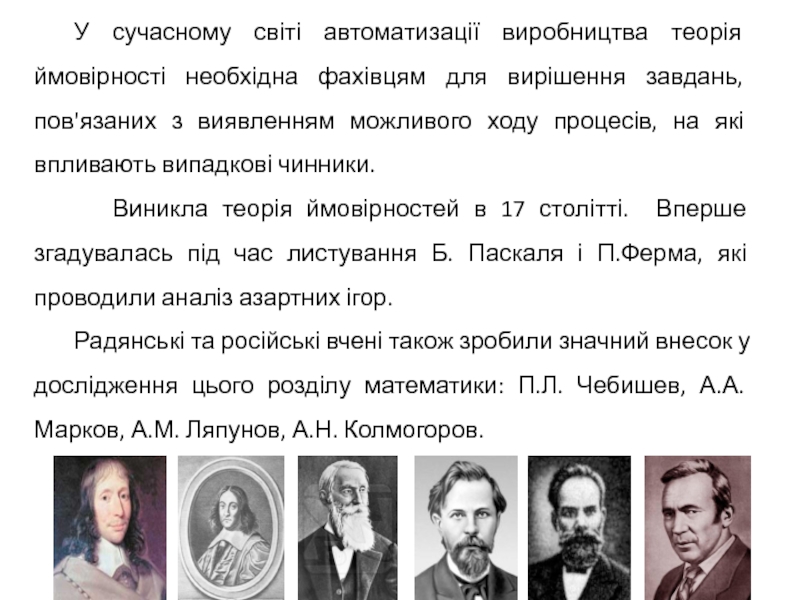Радянські та російські вчені також зробили значний внесок у дослідження цього розділу математики: П.Л. Чебишев, А.А. Марков, А.М. Ляпунов, А.Н. Колмогоров.