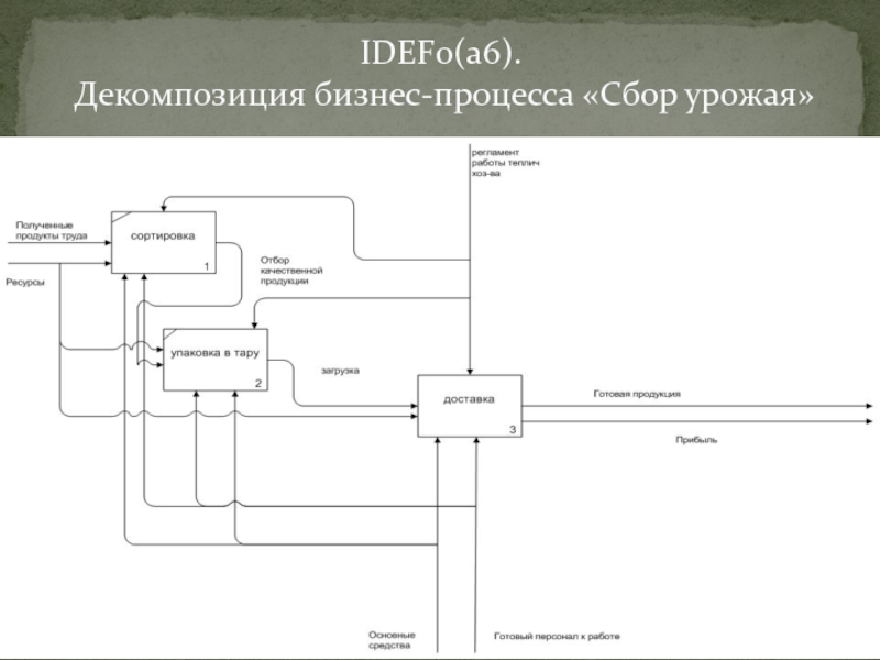Слайд 12IDEF0(a6). Декомпозиция бизнес-процесса «Сбор урожая»