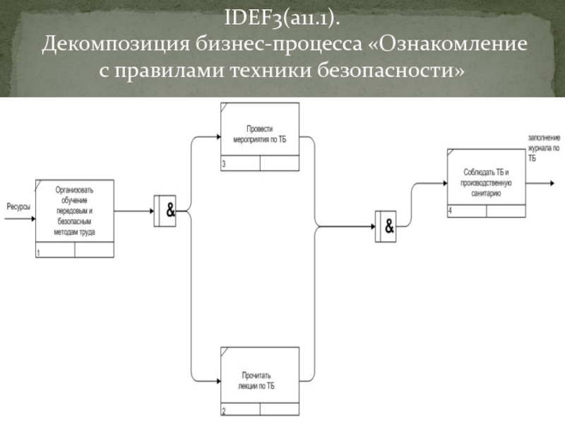 Слайд 6IDEF3(a11.1). Декомпозиция бизнес-процесса «Ознакомление с правилами техники безопасности»