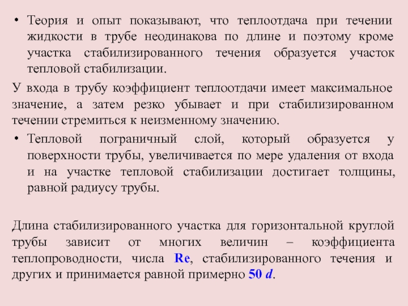 У входа в трубу коэффициент теплоотдачи имеет максимальное значение, а затем резко убывает и при стабилизированном течении стремиться к неизменному значению.