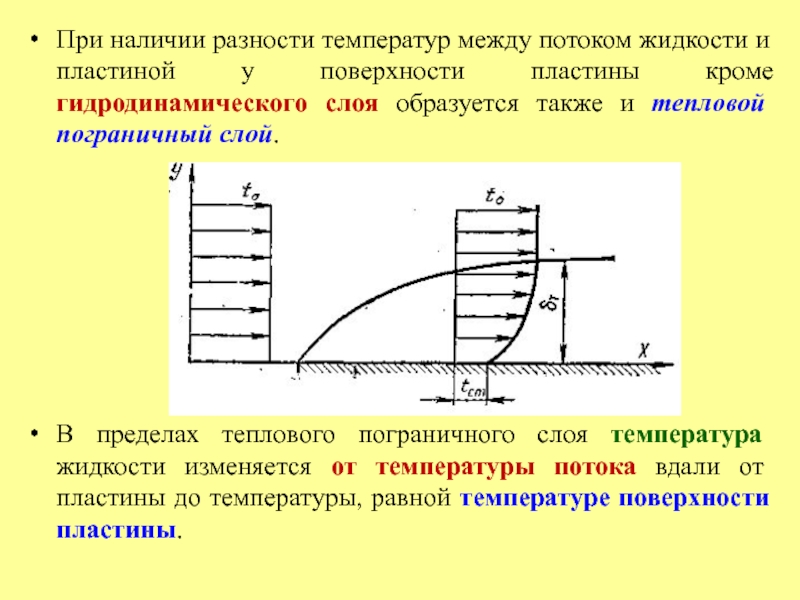 Слайд 31При наличии разности температур между потоком жидкости и пластиной у