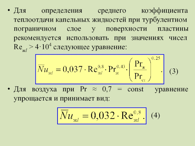 Слайд 37Для определения среднего коэффициента теплоотдачи капельных жидкостей при турбулентном пограничном