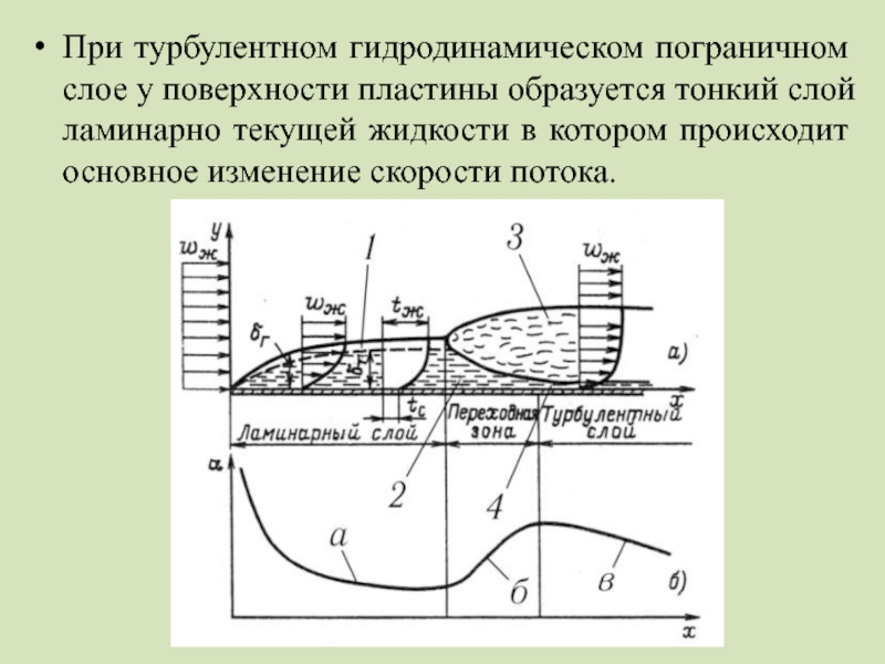 Слайд 35При турбулентном гидродинамическом пограничном слое у поверхности пластины образуется тонкий