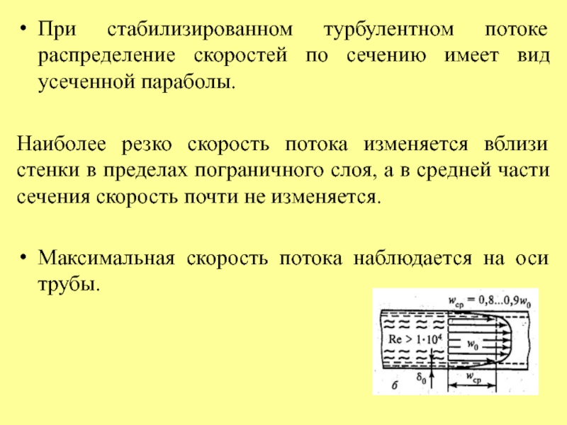 Слайд 21При стабилизированном турбулентном потоке распределение скоростей по сечению имеет вид