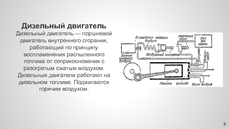 воздухом. Дизельные двигатели работают на дизельном топливе. Поджигаются горячим воздухом.