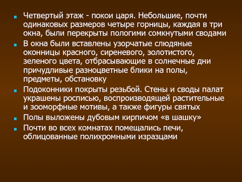 Слайд 6Четвертый этаж - покои царя. Небольшие, почти одинаковых размеров четыре