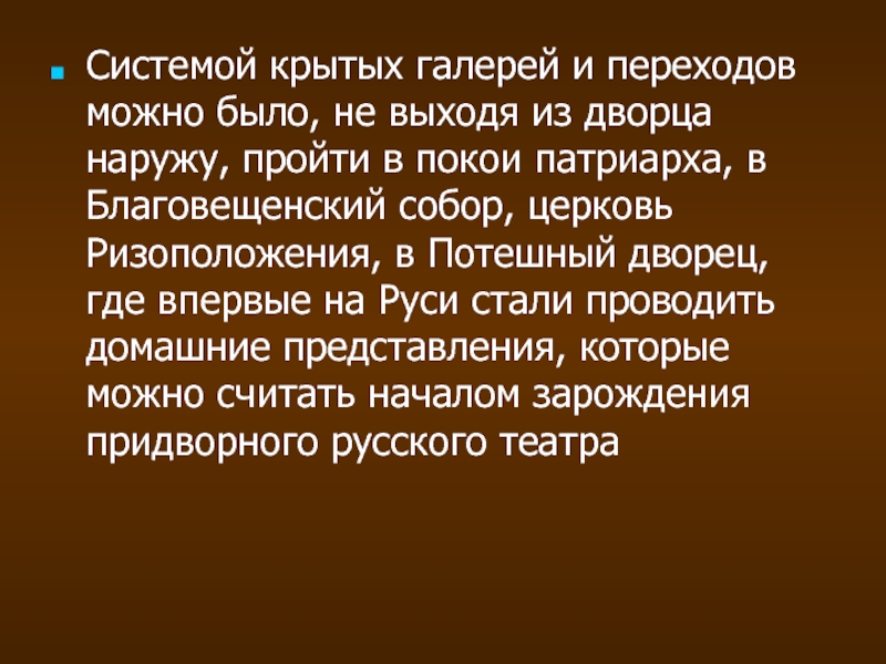 Ризоположения, в Потешный дворец, где впервые на Руси стали проводить домашние представления, которые можно считать началом зарождения придворного русского театра