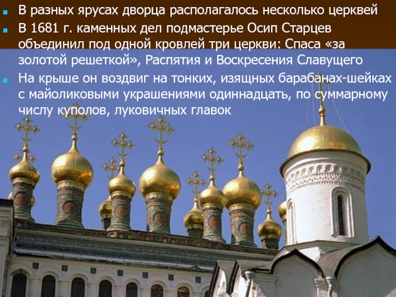 Слайд 4В разных ярусах дворца располагалось несколько церквей