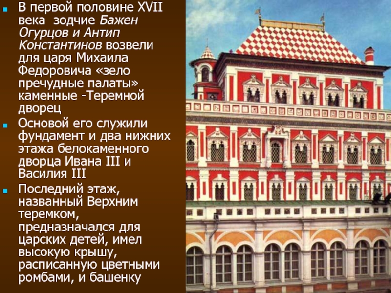 Последний этаж, названный Верхним теремком, предназначался для царских детей, имел высокую крышу, расписанную цветными ромбами, и башенку