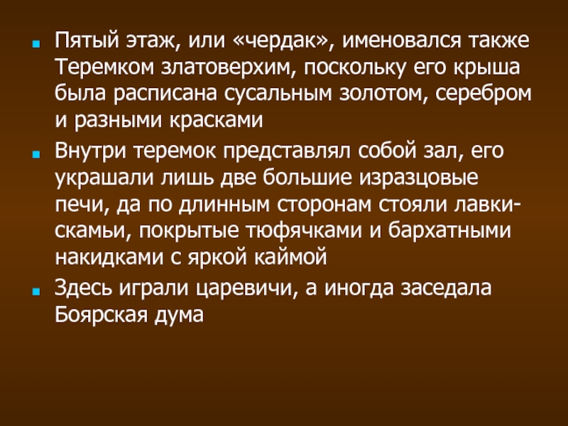 Слайд 16Пятый этаж, или «чердак», именовался также Теремком златоверхим, поскольку его