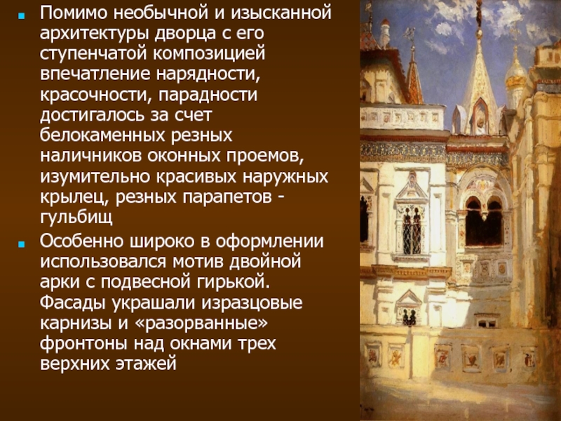 Таким образом, дворец приобрел характерный для русского зодчества того времени ступенчатый ярусный силуэт