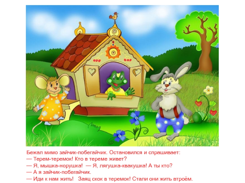 Бежал мимо зайчик-побегайчик. Остановился и спрашивает:— Терем-теремок! Кто в тереме живет?— Я, мышка-норушка! — Я, лягушка-квакушка! А