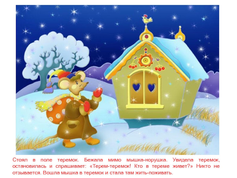 Слайд 2Стоял в поле теремок. Бежала мимо мышка-норушка. Увидела теремок, остановилась