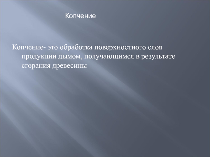 Слайд 2Копчение- это обработка поверхностного слоя продукции дымом, получающимся в результате