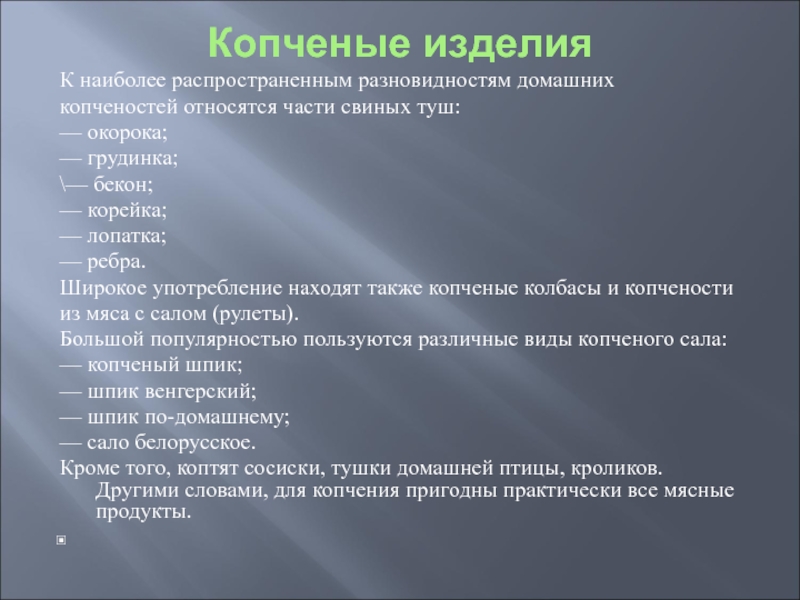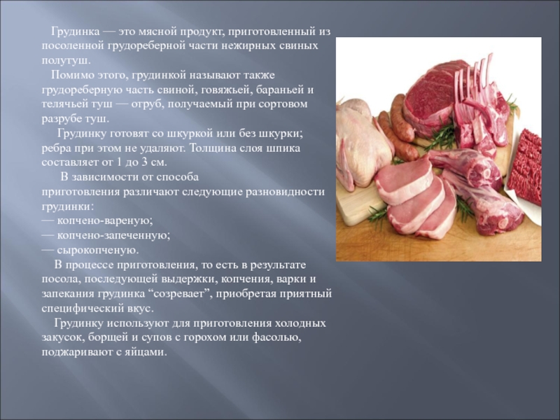 Слайд 10 Грудинка — это мясной продукт, приготовленный из