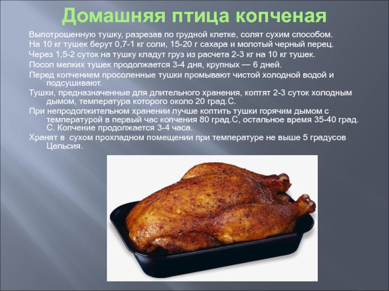 При непродолжительном хранении лучше коптить тушки горячим дымом с температурой в первый час копчения 80 град.С, остальное время 35-40 град.С. Копчение продолжается 3-4 часа.