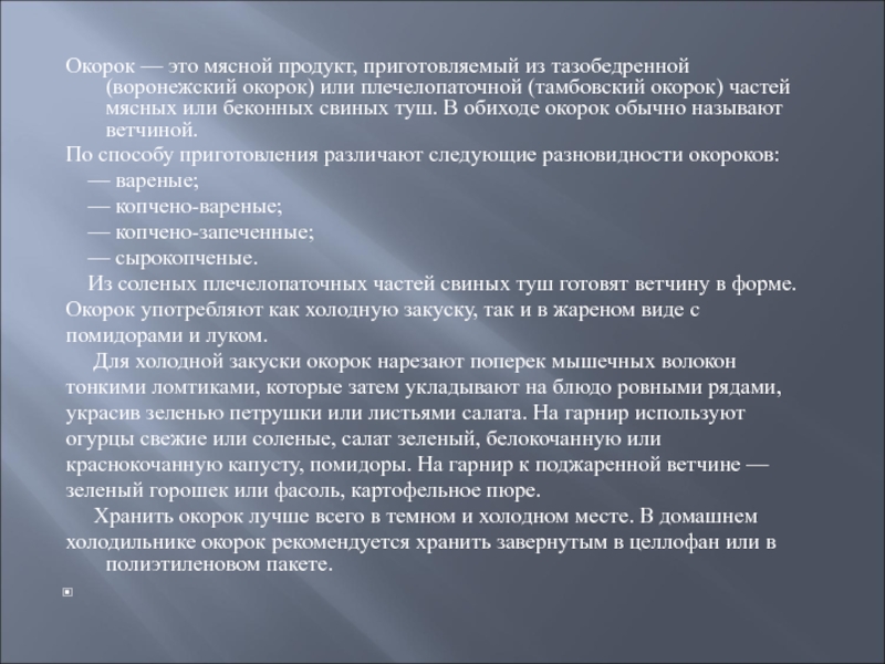 Слайд 9Окорок — это мясной продукт, приготовляемый из тазобедренной (воронежский окорок)