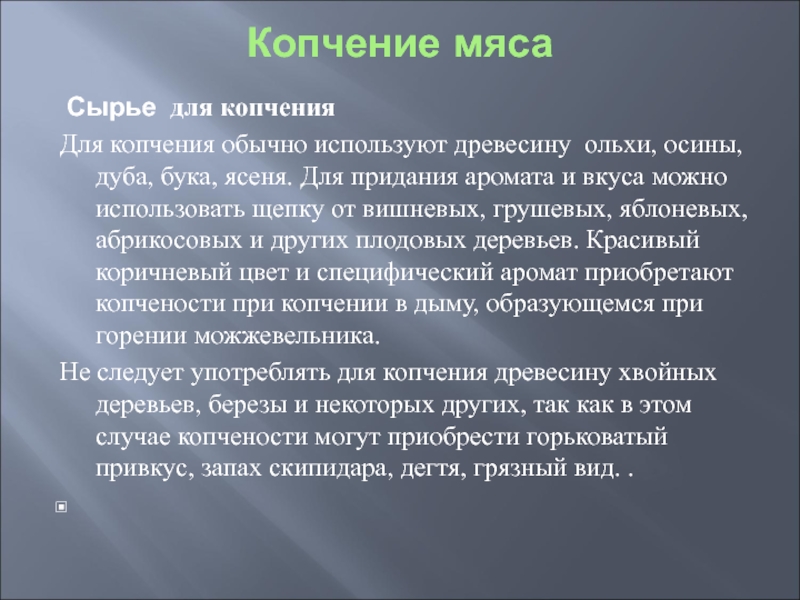 Не следует употреблять для копчения древесину хвойных деревьев, березы и некоторых других, так как в этом случае копчености могут приобрести горьковатый привкус, запах скипидара, дегтя, грязный вид. .