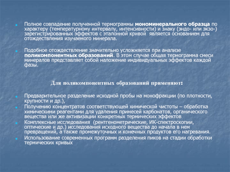 Слайд 42Полное совпадение полученной термограммы мономинерального образца по характеру (температурному интервалу,