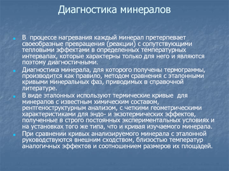 Диагностика минерала, для которого получены термограммы, производится как правило, методом сравнения с эталонными кривыми минеральных фаз, приводимых в справочной литературе.