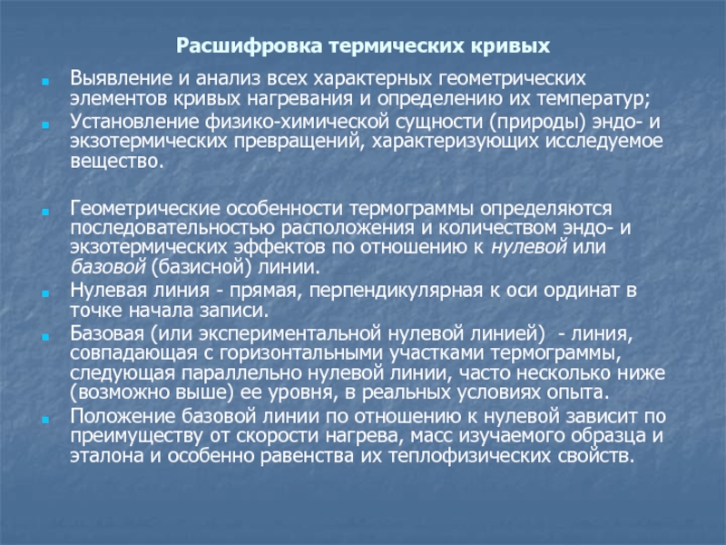 Геометрические особенности термограммы определяются последовательностью расположения и количеством эндо- и экзотермических эффектов по отношению к нулевой или базовой (базисной) линии.