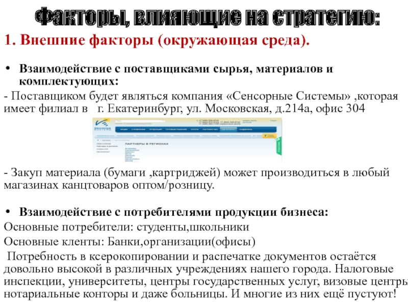 Факторы, влияющие на стратегию: 1. Внешние факторы (окружающая среда). Взаимодействие с поставщиками сырья, материалов и комплектующих:- Поставщиком будет являться компания «Сенсорные Системы» ,которая имеет филиал в   г. Екатеринбург, ул. Московская, д.214а,