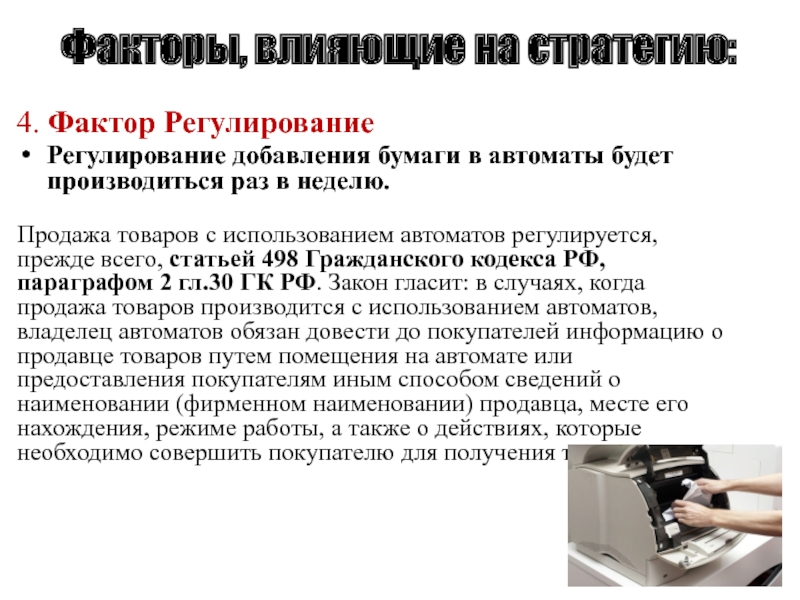 Факторы, влияющие на стратегию: 4. Фактор РегулированиеРегулирование добавления бумаги в автоматы будет производиться раз в неделю. Продажа