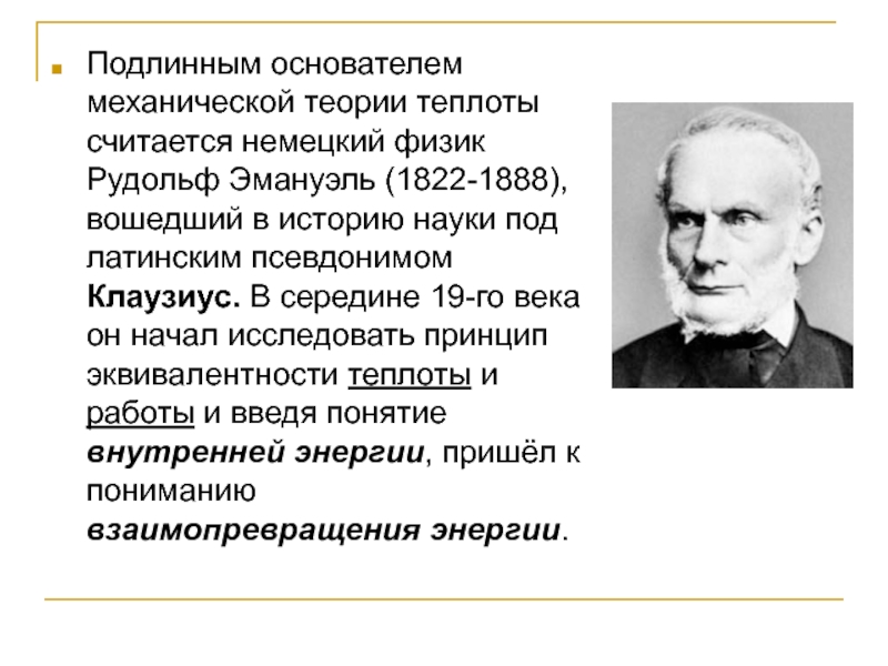 Слайд 8Подлинным основателем механической теории теплоты считается немецкий физик Рудольф Эмануэль