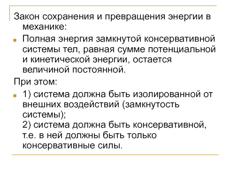 Слайд 14Закон сохранения и превращения энергии в механике: