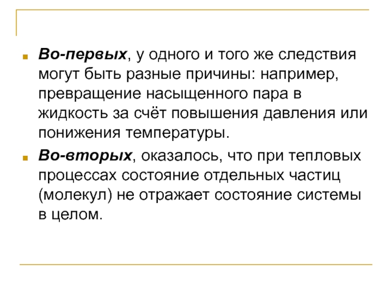 Во-вторых, оказалось, что при тепловых процессах состояние отдельных частиц (молекул) не отражает состояние системы в целом.