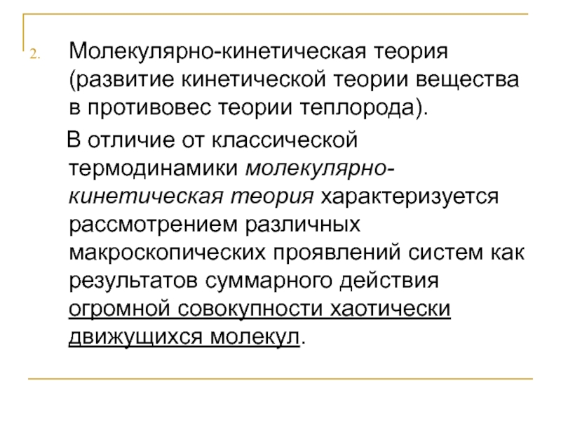 Слайд 20Молекулярно-кинетическая теория (развитие кинетической теории вещества в противовес теории теплорода).