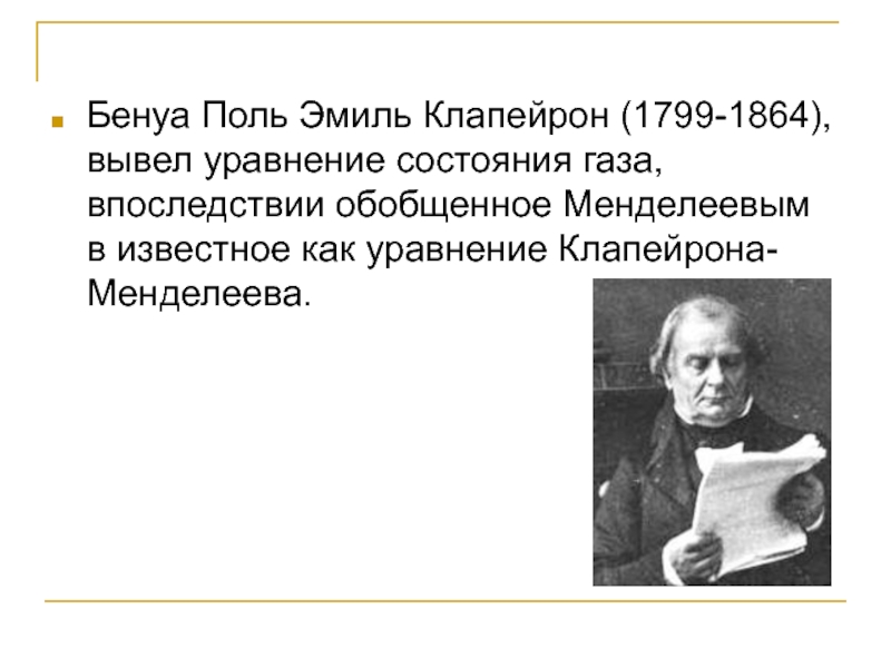 Слайд 7Бенуа Поль Эмиль Клапейрон (1799-1864), вывел уравнение состояния газа, впоследствии