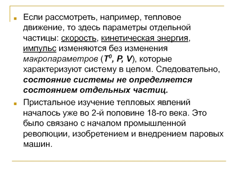 Слайд 4Если рассмотреть, например, тепловое движение, то здесь параметры отдельной частицы: