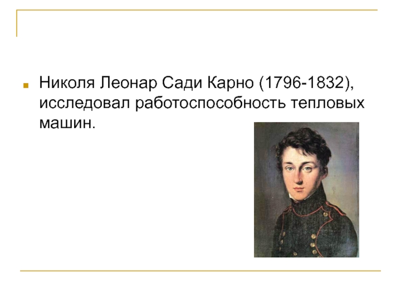 Слайд 6Николя Леонар Сади Карно (1796-1832), исследовал работоспособность тепловых машин.