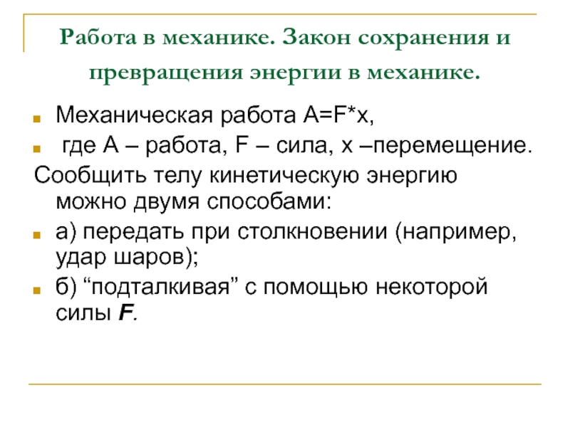 Слайд 9Работа в механике. Закон сохранения и превращения энергии в механике.