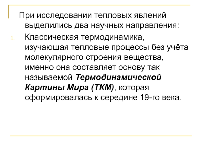 Слайд 19 При исследовании тепловых явлений выделились два научных направления: