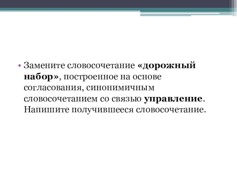 Слайд 13Замените словосочетание «дорожный набор», построенное на основе согласования, синонимичным словосочетанием со
