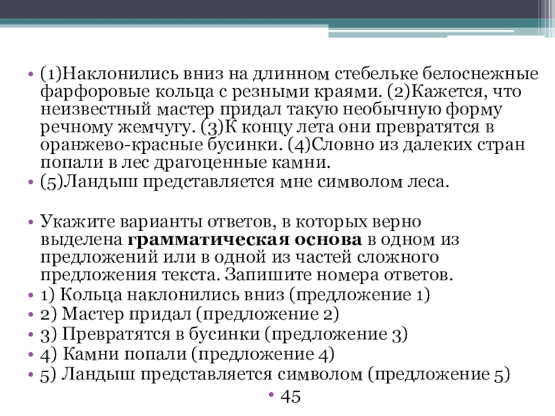 жемчугу. (3)К концу лета они превратятся в оранжево-красные бусинки. (4)Словно из далеких стран попали в лес драгоценные камни.