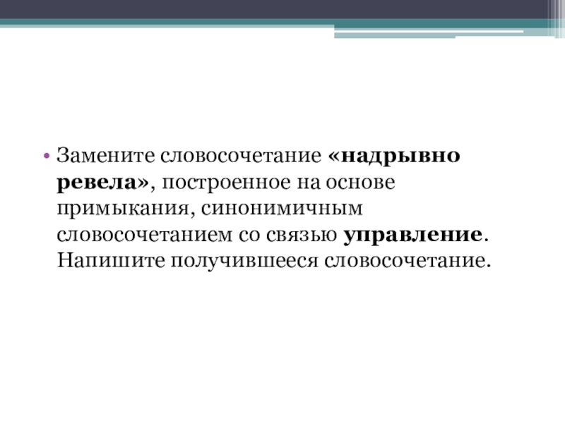 Слайд 12Замените словосочетание «надрывно ревела», построенное на основе примыкания, синонимичным словосочетанием со