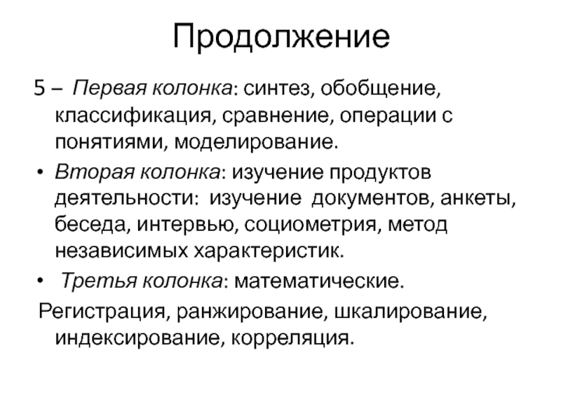 Продолжение5 – Первая колонка: синтез, обобщение, классификация, сравнение, операции с понятиями, моделирование.Вторая колонка: изучение продуктов деятельности: изучение