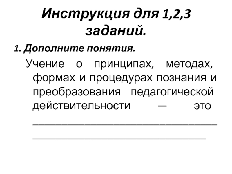 Инструкция для 1,2,3 заданий. 1. Дополните понятия.Учение о принципах, методах, формах и процедурах познания и преобразования педагогической действительности — это ______________________________________________________________