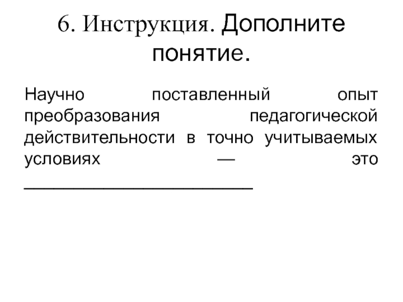 6. Инструкция. Дополните понятиe.Научно поставленный опыт преобразования педагогической действительности в точно учитываемых условиях — это _______________________