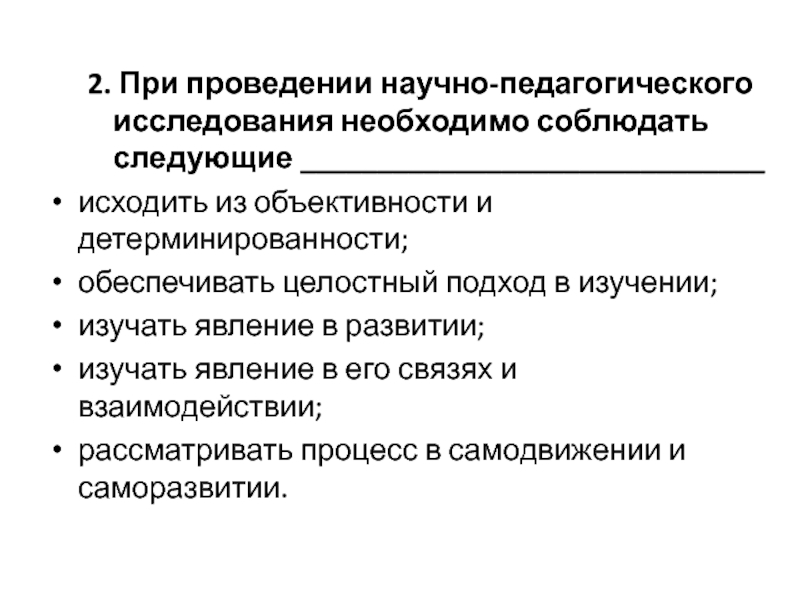 2. При проведении научно-педагогического исследования необходимо соблюдать следующие ______________________________	исходить из объективности и детерминированности;обеспечивать целостный подход в изучении;изучать