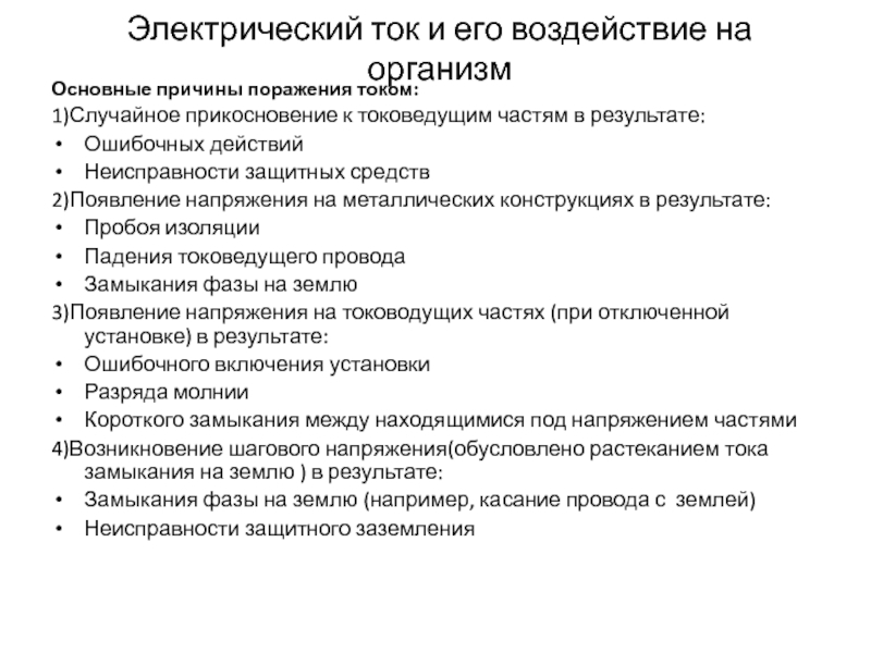 Основные причины поражения током: