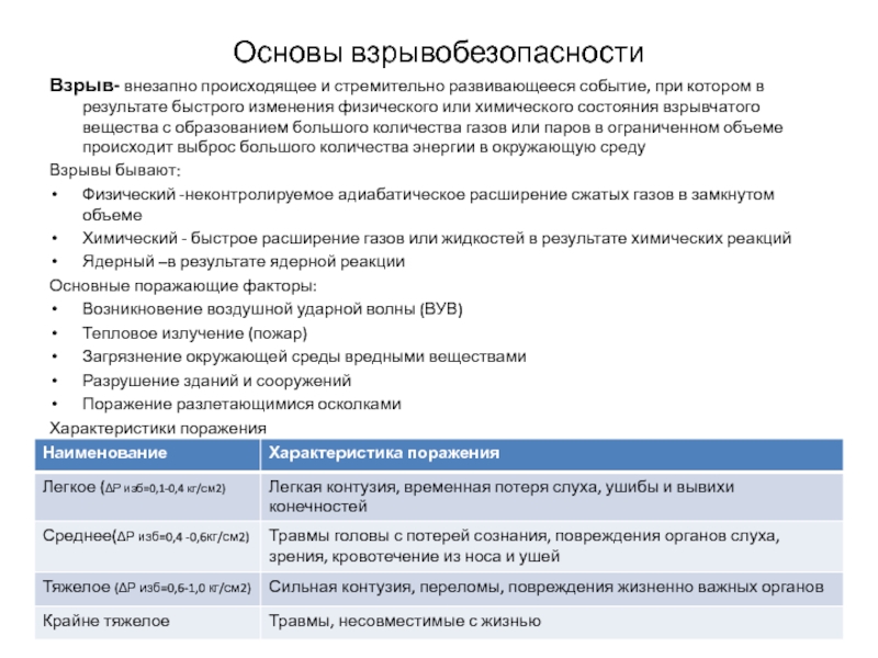 Основная опасность- возможное разрушение емкости под действием внезапного адиабатического расширения газов или паров (физический взрыв) или в результате химической реакции с выделением газов, паров, тепла (химический взрыв)