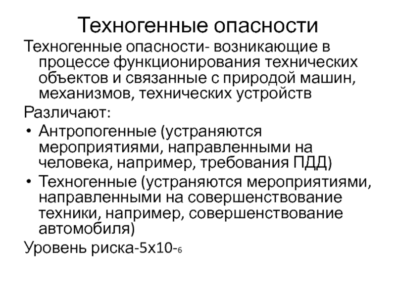 Техногенные (устраняются мероприятиями, направленными на совершенствование техники, например, совершенствование автомобиля)