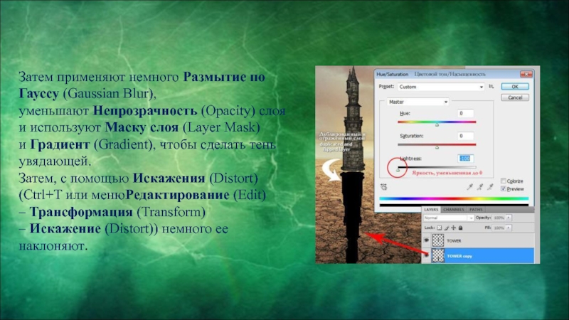 Слайд 10Затем применяют немного Размытие по Гауссу (Gaussian Blur), уменьшают Непрозрачность (Opacity) слоя и используют Маску
