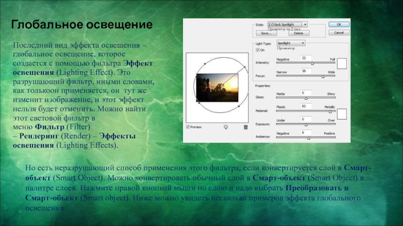 Но есть неразрушающий способ применения этого фильтра, если конвертируется слой в Смарт-объект (Smart Object). Можно конвертировать обычный слой в Смарт-объект (Smart Object) в палитре слоев. Нажмите правой кнопкой мыши по слою и надо выбрать Преобразовать в Смарт-объект (Smart object). Ниже можно увидеть несколько примеров эффекта глобального освещения.
